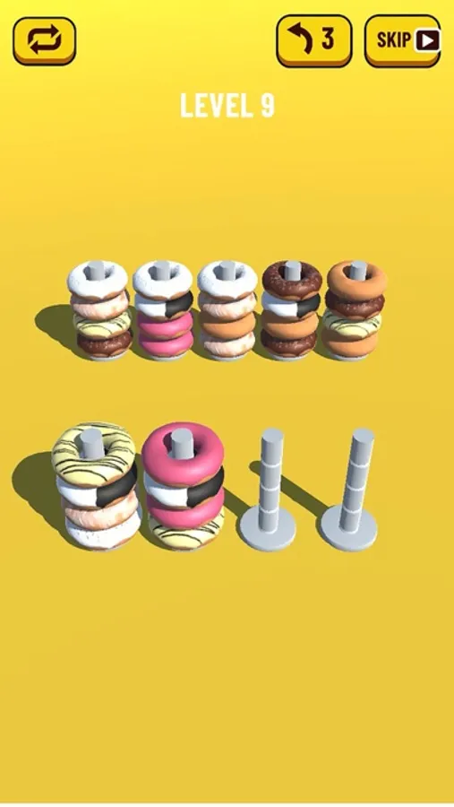 Donut Stack is a fun and addictive puzzle game! Try to sort the colored donuts until all donuts with the same color stay in the same place. A challenging yet relaxing game to exercise your brain!