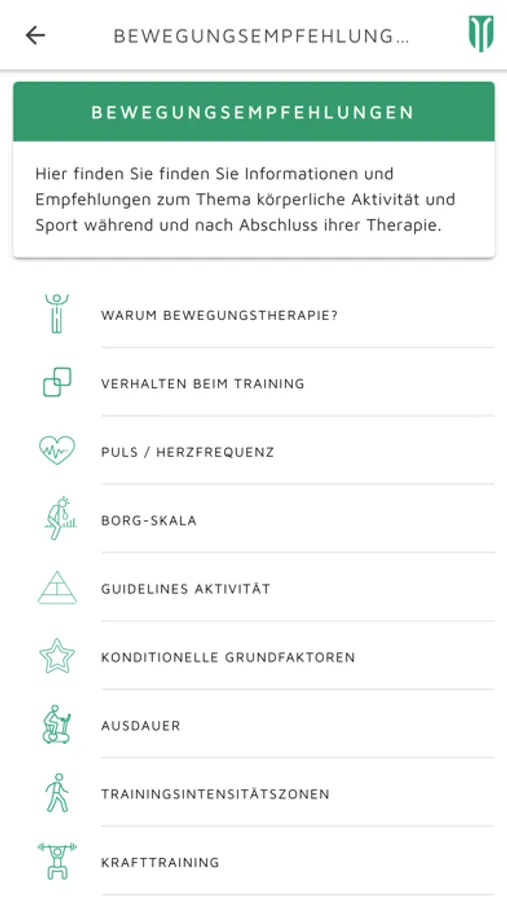 Sie erhalten einen Überblick über ihr Krankheitsbild, Bewegungsempfehlungen und Übungen. Zudem können Sie einen individuellen Trainingsplan erstellen und im Trainings-Journal ihre sportlichen Aktivitäten übersichtlich dokumentieren.