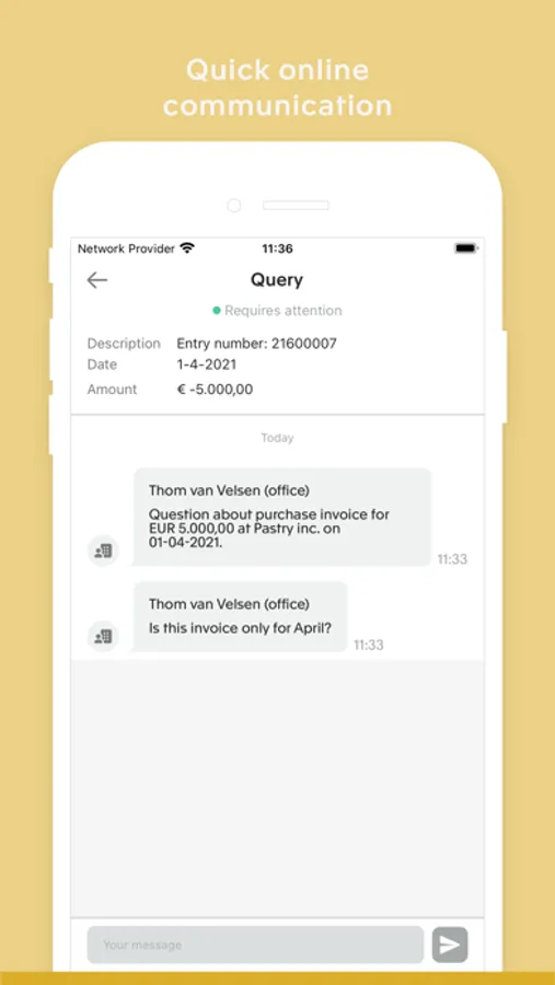 The Exact My[Firm] app gives you all the tools you need to run your business efficiently. You can communicate and exchange documents with your accountant in real-time in a chat window, so your financial data is always up-to-date. You can also process all your financial transactions in the app (invoicing, VAT returns, payments, etc.), so you never miss a payment or a deadline.