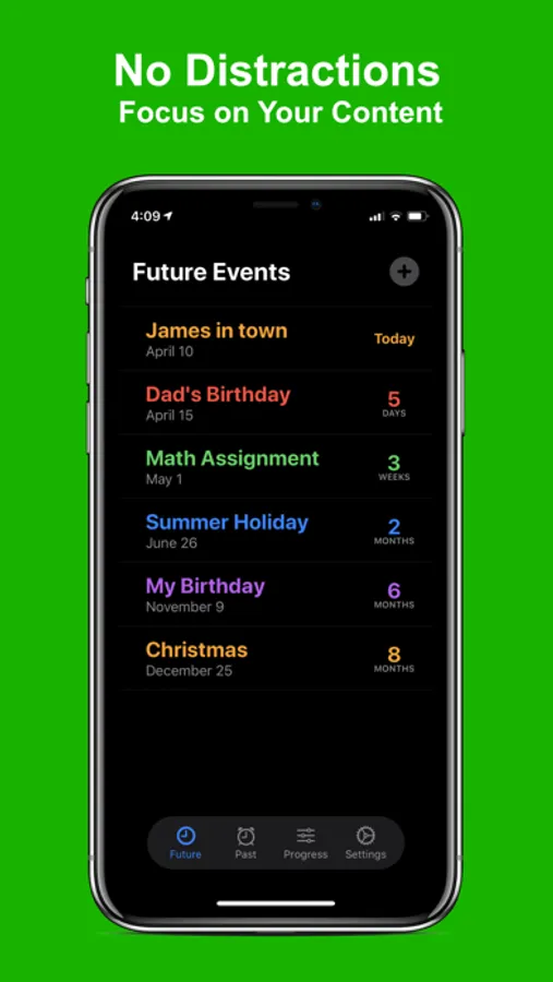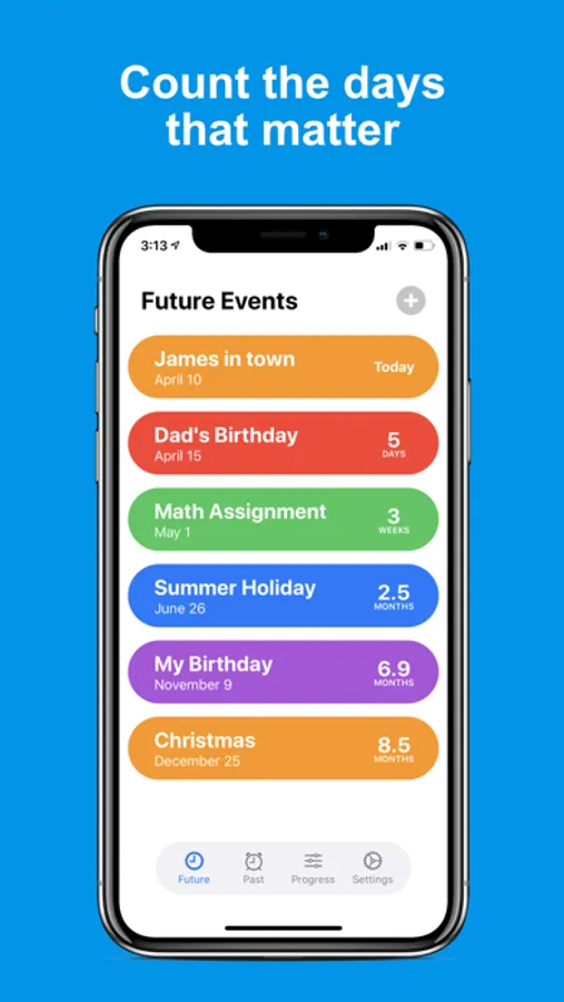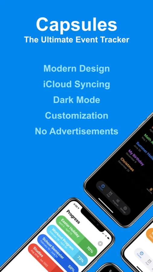 Capsules enables you to easily keep track of what matters to you, be it birthdays, holidays or math assignments. You can also track the progress of an ongoing event to see how far you've come! Events are synced seamlessly over iCloud so they are accessible on all your devices.