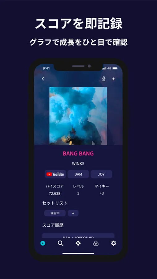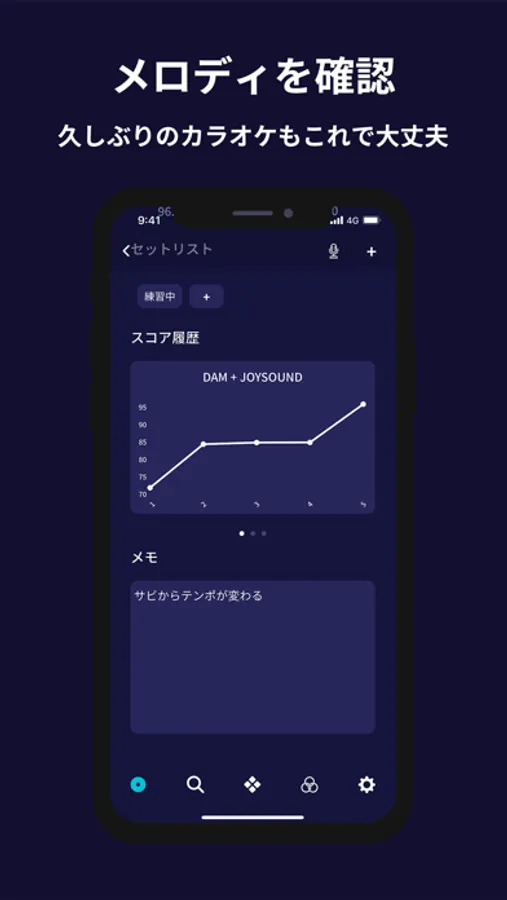 『スコア記録』は、歌の邪魔をしないように素早い得点の記録ができて、しかもグラフで成長度まで!