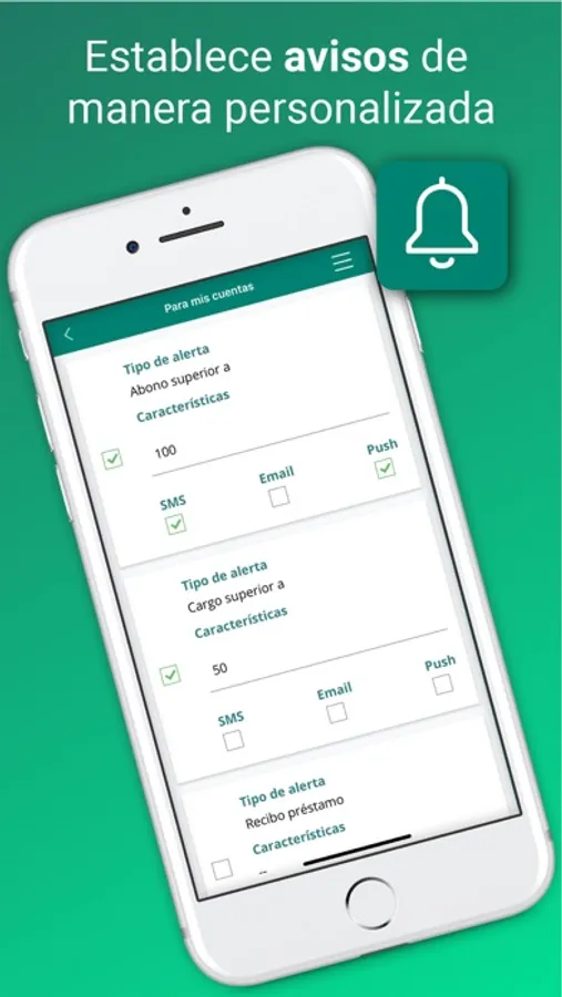 Para una mayor seguridad y control podrás activar alertas a tus cuentas o tarjetas de tal forma que te llegue un aviso en cuanto se registre un movimiento o pago en función de lo que se haya configurado en la alerta.