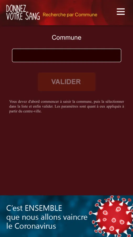La rubrique "Recherche par commune" fonctionne de la même manière que "Autour de moi", à cette différence que le point GPS de référence n'est plus votre position géographique du moment mais le centre ville même de le commune désignée. Pour accéder à la liste des lieux de collecte de sang, vous devez d'abord commencer à saisir la commune, puis la sélectionner dans la liste et enfin valider.