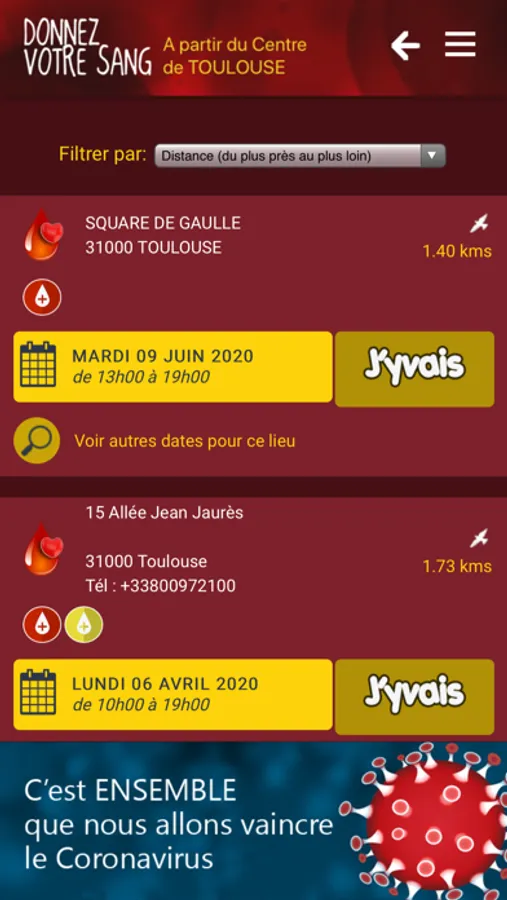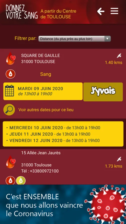 Cette rubrique vous permet de connaître tous les lieux de collecte de sang se trouvant autour de votre position, que ce soit en mode ambulatoire ou en mode fixe. Deux filtres sont proposés : Le filtre "Date" qui liste les lieux en fonction de leur échéance, et le filtre "Distance" qui liste les lieux en fonction de leur éloignement. C'est le filtre "Distance" qui est utilisé par défaut.