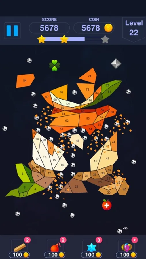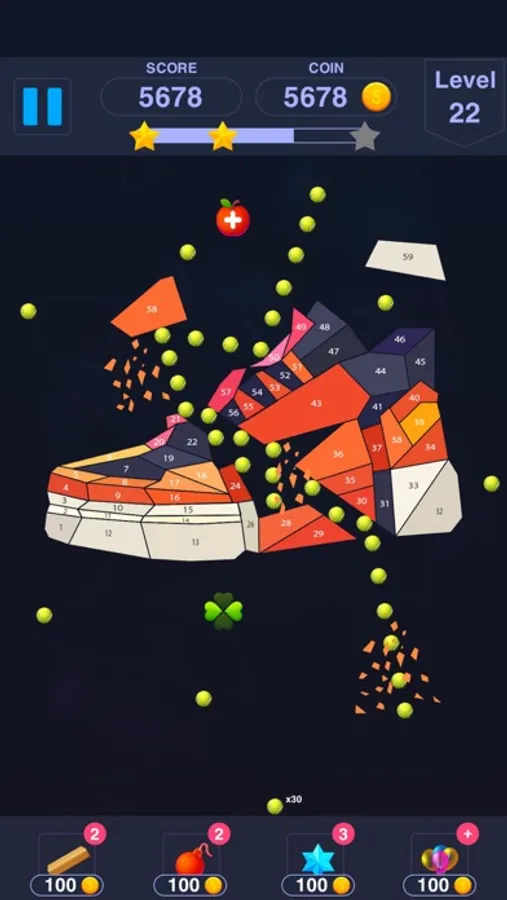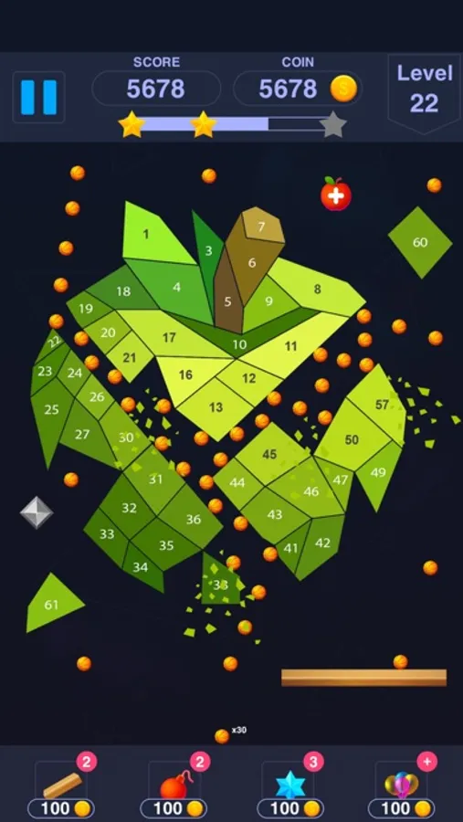 - Each level will have different initial number of balls, when the ball moves and touch the apple on the screen, you will be added the ball for the next ball shot.