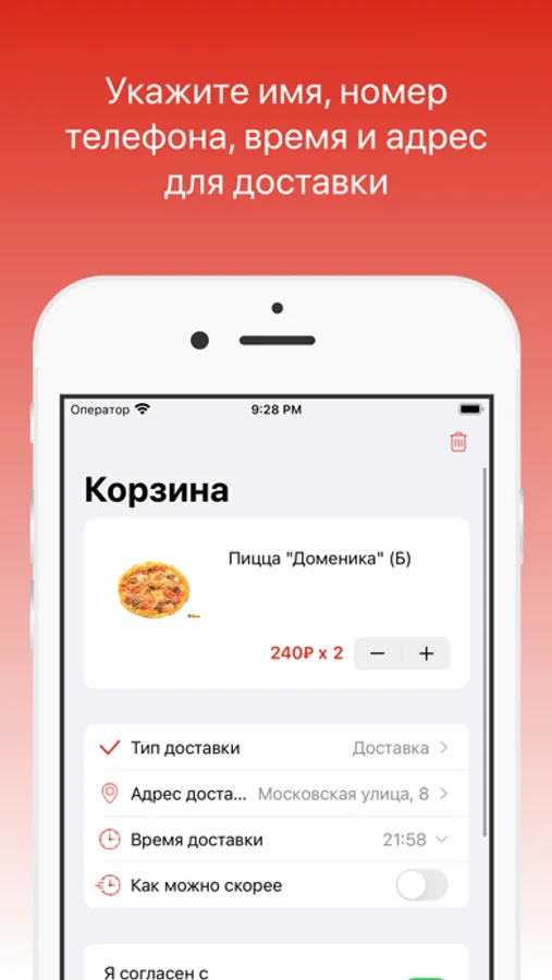 Укажите время, когда хотите прийти за своим заказом или выберите доставку с указанием времени и адреса доставки.