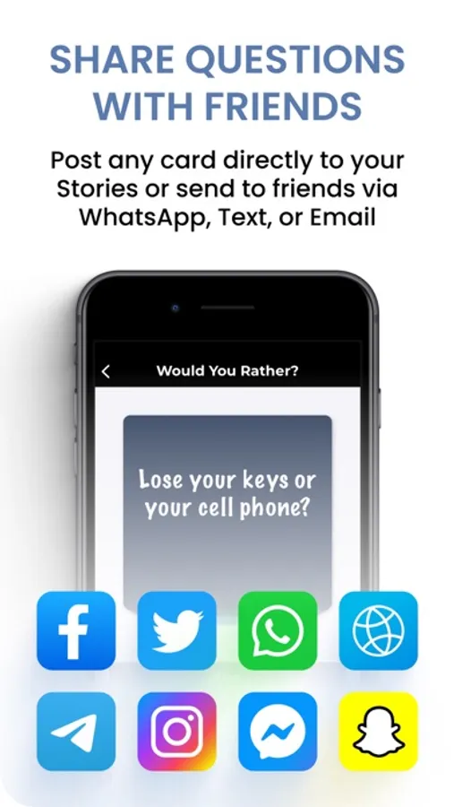 Easily share question cards to both Instagram & Facebook Stories to poll your friends on their answers.