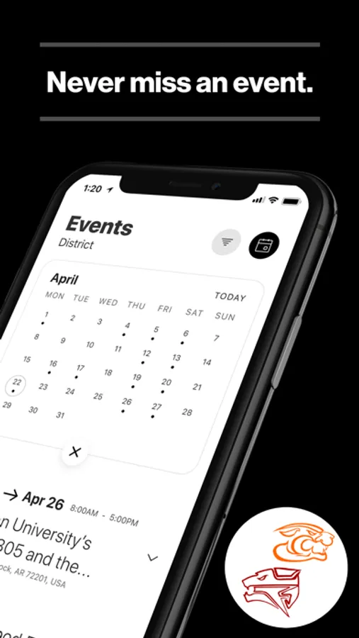 The event section shows a list of events throughout the district. Users can add an event to their calendar to share the event with friends and family with one tap.