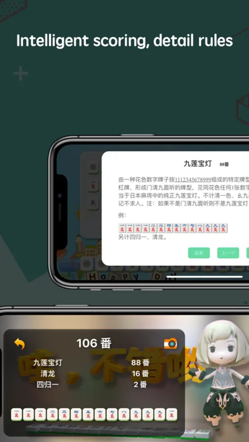 2. Enter mahjong hand tiles, it can automatically calculate the scores according to the Chinese standard rules or Japanese(Riichi) mahjong rules, and it can also assist in the calculation when playing mahjong.