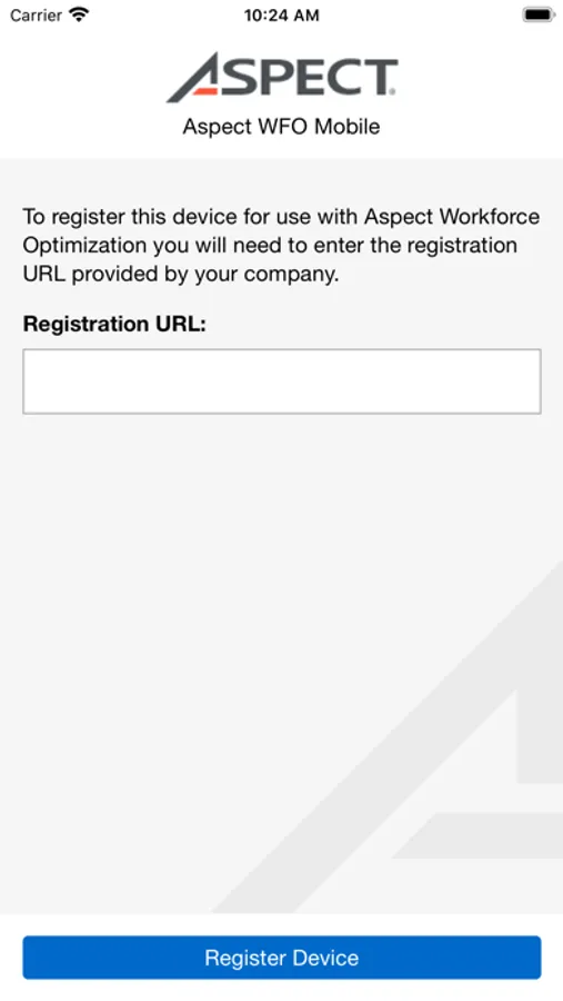 To register this device for use with Aspect Workforce Optimization you will need to enter the registration URL provided by your company.