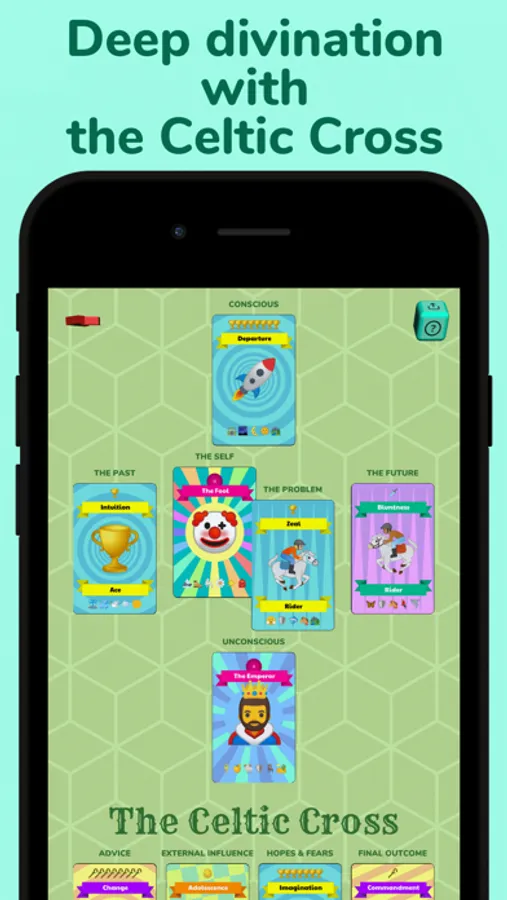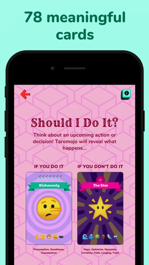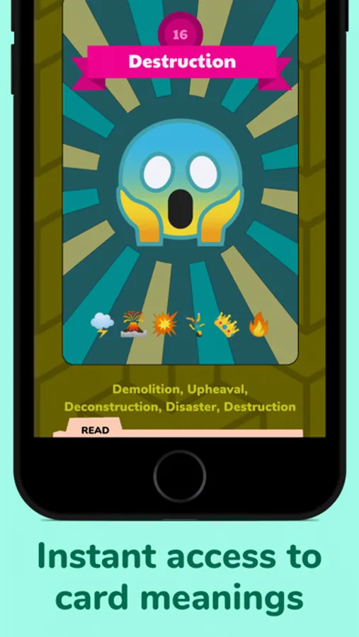 This app features Tarot cards with clear and direct Emoji symbolism. This new take on Tarot cards allows you to quickly understand the card meanings, which makes it perfect for beginners. Bright colours add a light-hearted tone to their existential themes. Each card features additional Emojis at the bottom that unfold the broad symbolism of the classic Rider Waite Tarot cards.