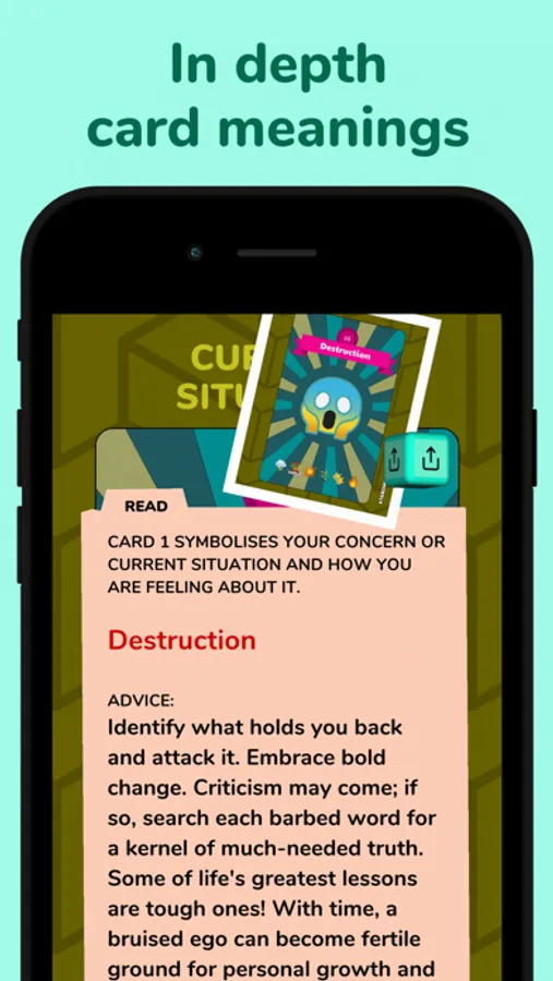 In the readings you can quickly zoom in and out of your cards to reflect on their meanings. Instant keywords will guide your own interpretation of the card’s meaning. For a deeper understanding you can easily access detailed card explanations for personal development, partnership analysis, work advice and more.