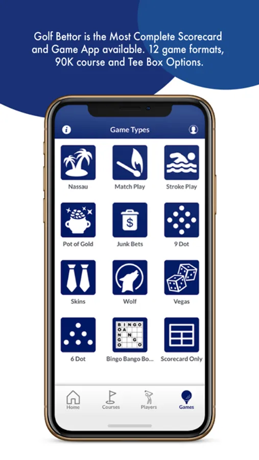 Golf Bettor has 12 game formats with 65 different options, 18,000 courses and over 85,000 tee box options in the US and Canada making for over 5 million game combinations.
