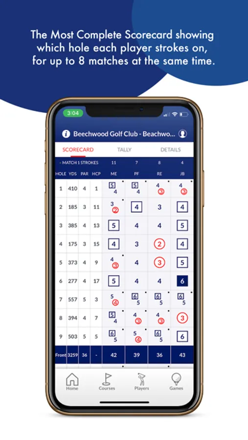 The app has a simple yet powerful scorecard that can support dynamic scorekeeping and match tallies across multiple foursomes.