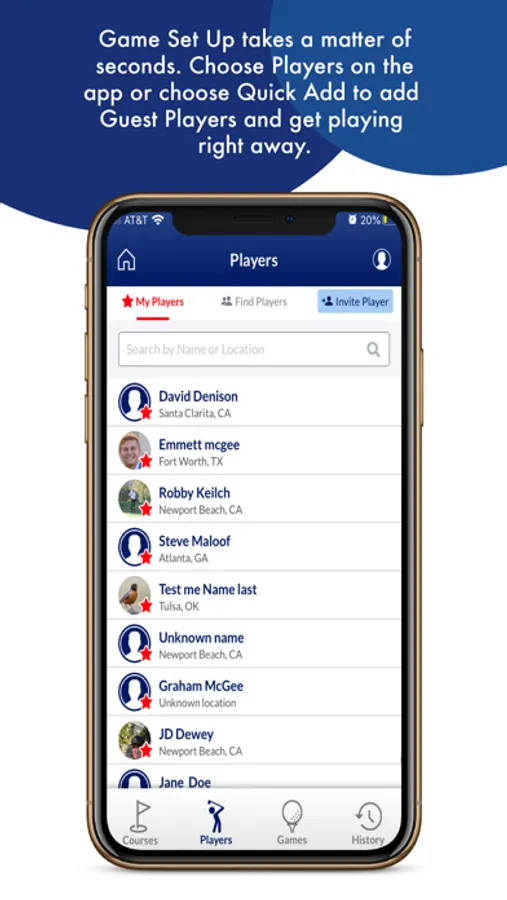 • Players: Play with your 3 or 33 of your closest friends – the Golf Bettor app can do that. Search and save your Favorite Players on the App or Add a Guest Player. Confirm their handicap and you’re ready to Play.