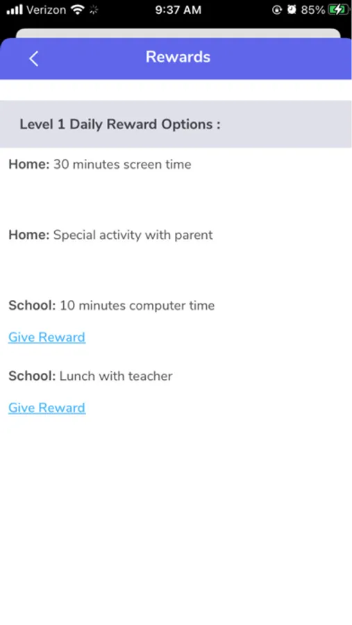 Customizable reward system: Parents create a home reward menu to celebrate children’s success with goals. When needed, teachers can also provide rewards at school.