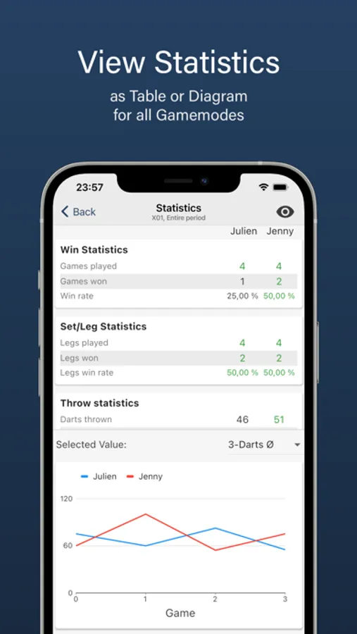 View extensive statistics about your dart games. There are many statistics for all game modes, which you can view both as a table and as a graph. In order not to lose the overview you can choose which statistics you want to see and which not.