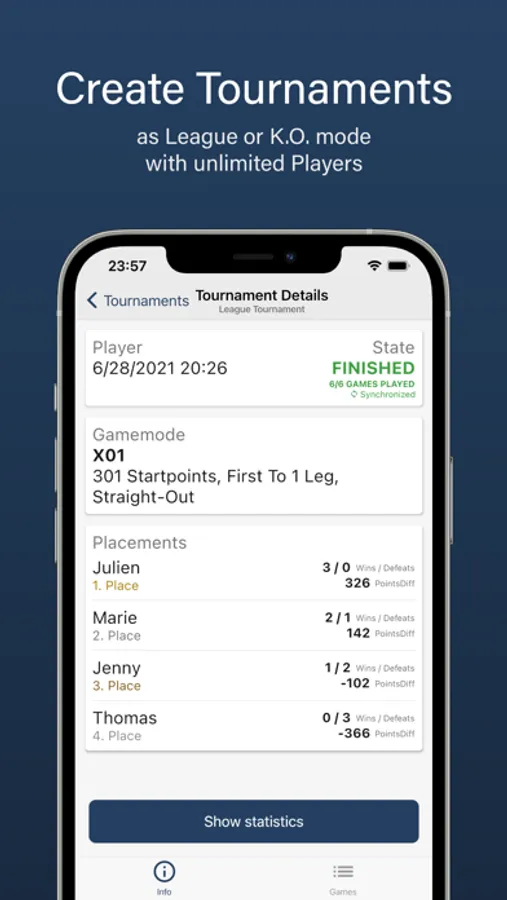 In tournament mode you can organize a league or knockout tournament with many people. A tournament schedule with a game list is automatically calculated and you can play the games one after the other. At any time you can see the current standings or who made it to the finals.