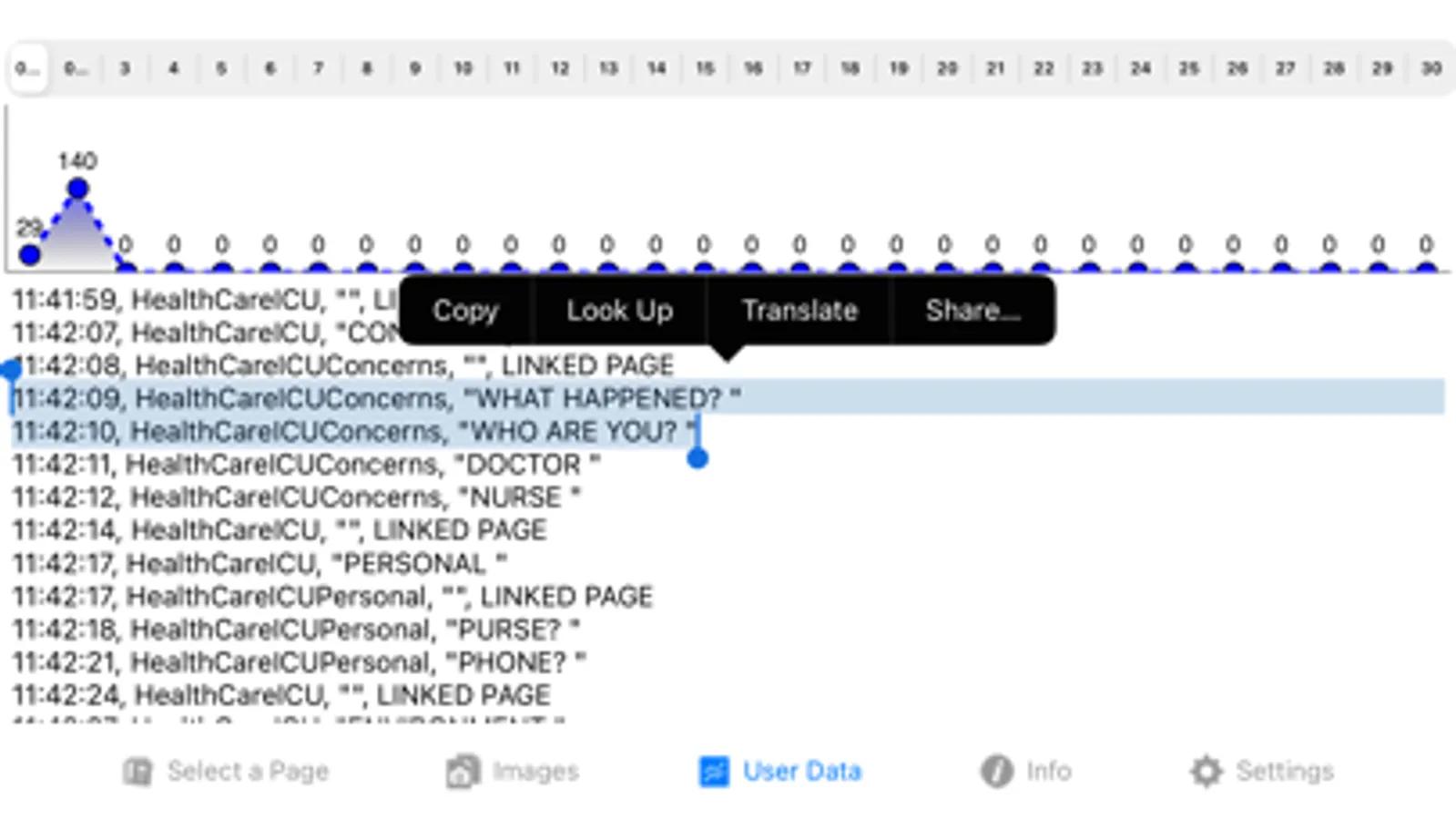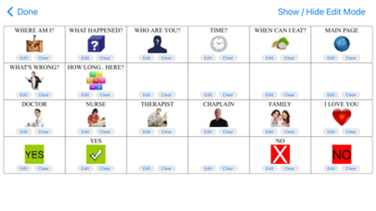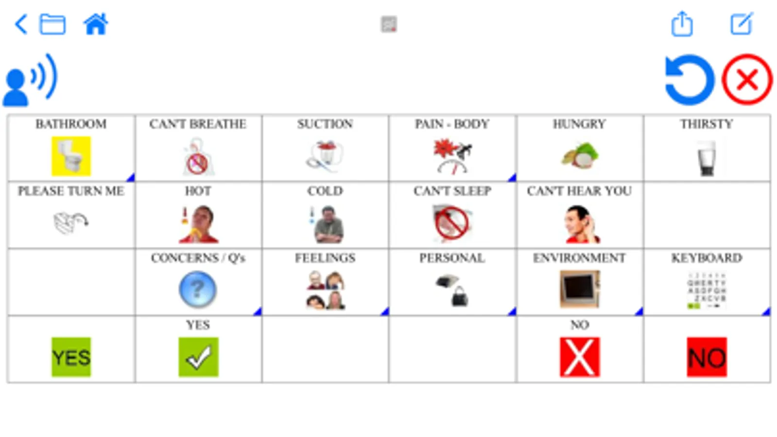 A collection of linked augmentative communication pages for a literate, fluent AAC user in a hospital intensive care unit.
