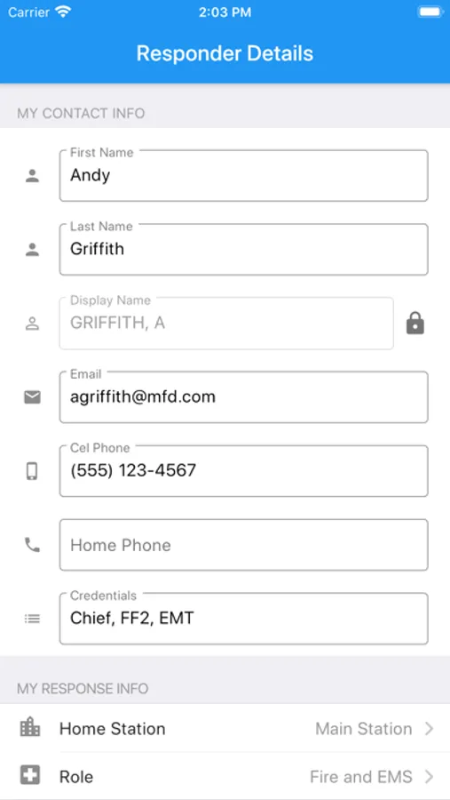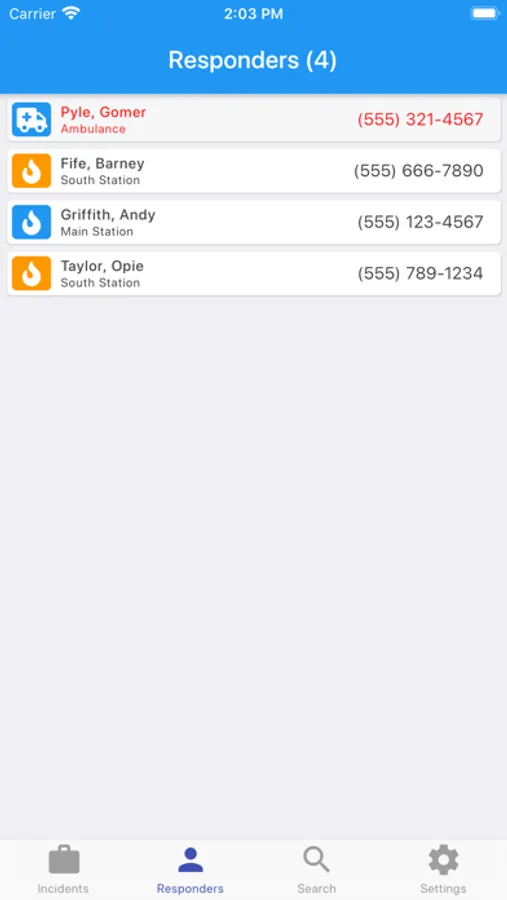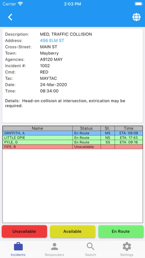 When a new incident is dispatched via CAD, it will show up nearly immediately in the app, and first responders can set their response (En Route, Available, Unavailable), along with response time and station. This allows fellow responders to quickly see who is responding to an incident and when they will be there.