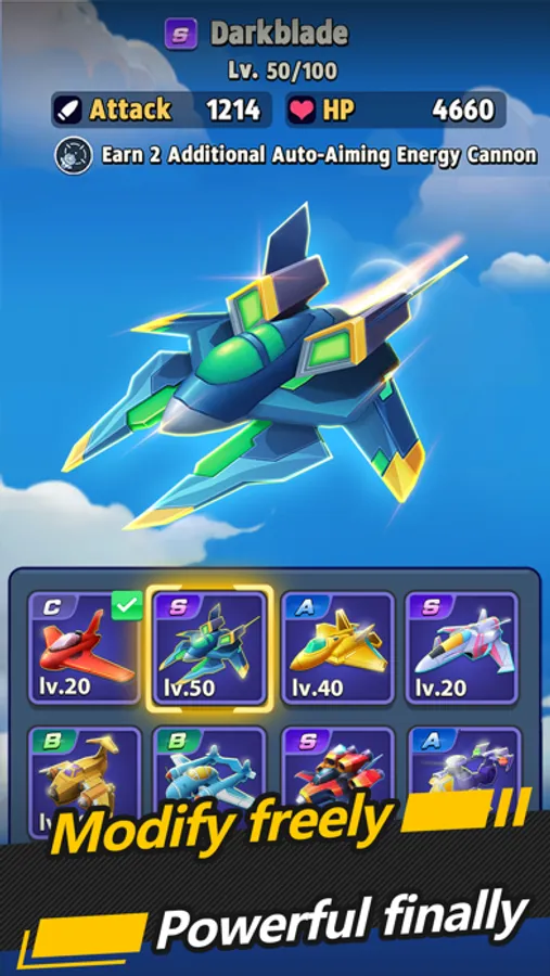 Choose your favorite base model of the fighter and build it up from then! Modify the jet with any imaginable parts. More than 100 distinctive yet essential upgradable aircraft components at different rarity empowers you to assemble your customized fighter that only belongs to you! Your modifications to the fighter are visible and eventually your fighter will evolve into a galaxy space battleship!