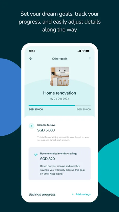 • Goals: Set goals for your future and track your financial progress towards realising them