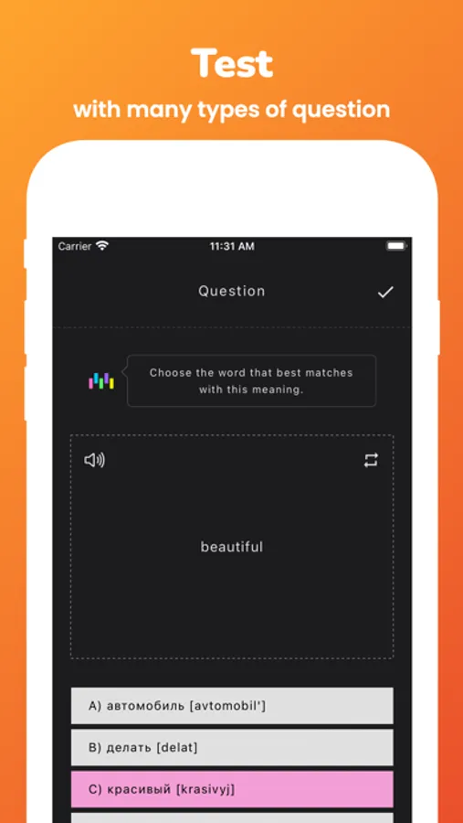 -Support many types of test for learning Russian (Multiple choice question, listening, matching, flipping flashcard and etc.)