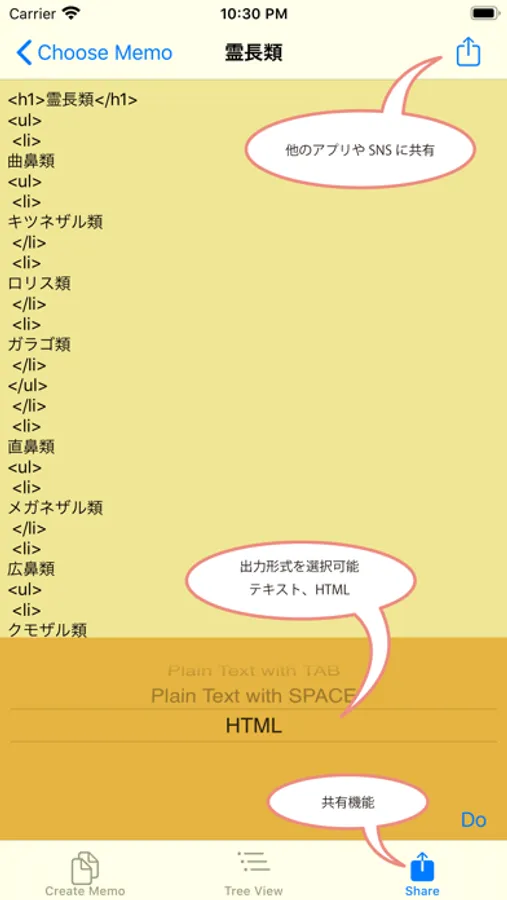 It is also possible to export to other apps and SNS in a tree view mode that gives a bird's eye view of the whole, or in plain text format or HTML format.