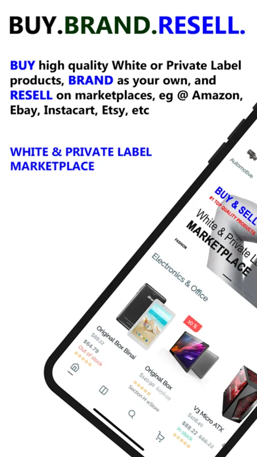 BUY high quality White or Private Label products, BRAND as your own, and RESELL on marketplaces, eg @ Amazon, Ebay, Instacart, Etsy, etc.
