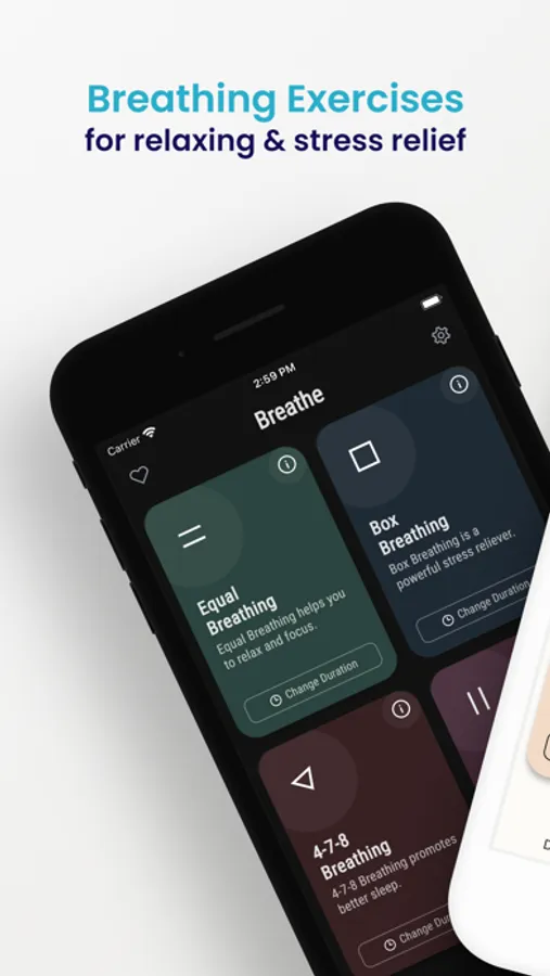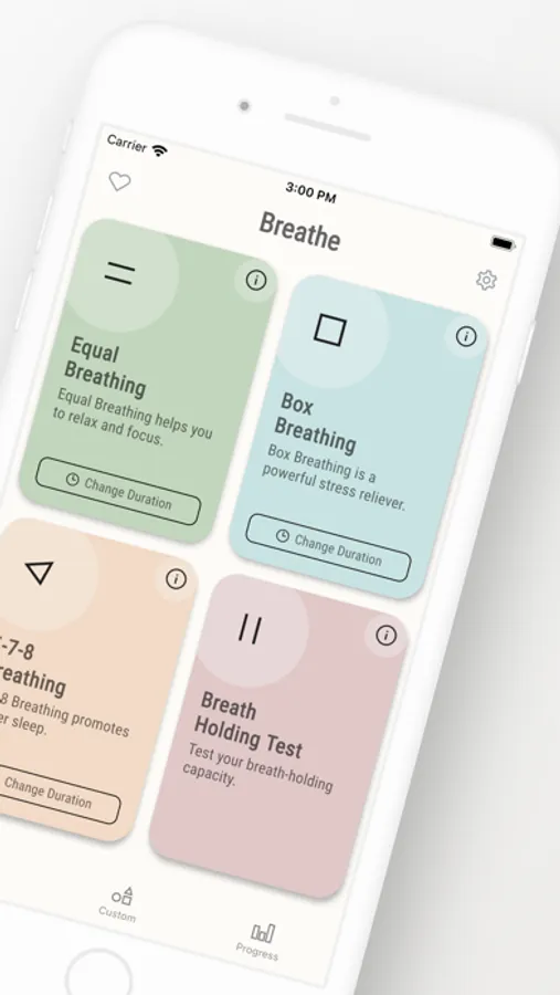 Breathe has 3 default breathing exercises and allows you to create your own custom breathing patterns: