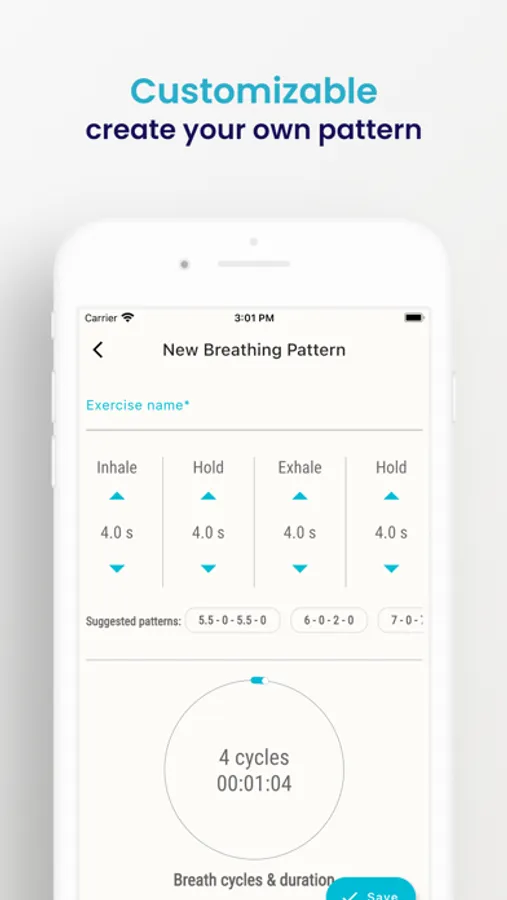 - Custom Pattern: create unlimited breathing patterns and fine-tune the inhale, exhale, and hold time by 0.1 second