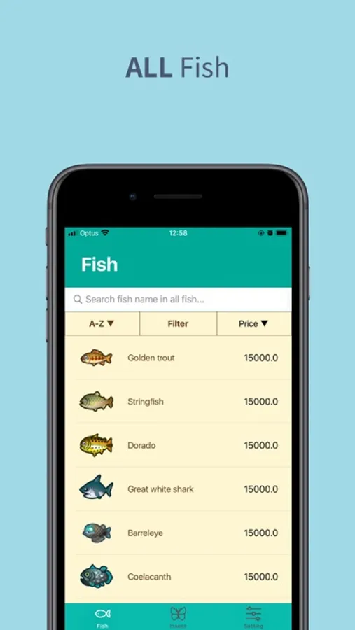 * Fish list includes 80 fish, including fish name, selling price, time of occurrence, place of occurrence, best seasons to catch, etc