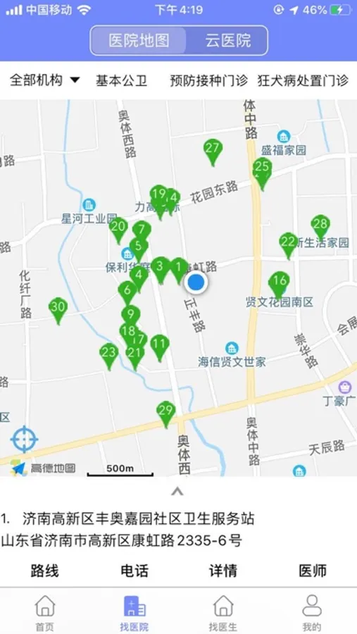 1、结合居民或患者的求医需求和位置信息,点击找医院、找医生,可以查询到国家认证的医疗卫生机构或执业医师。帮助患者合理规划就医路线,节省就医时间。系统会优先推荐最近的诊疗机构并导航至目的地。