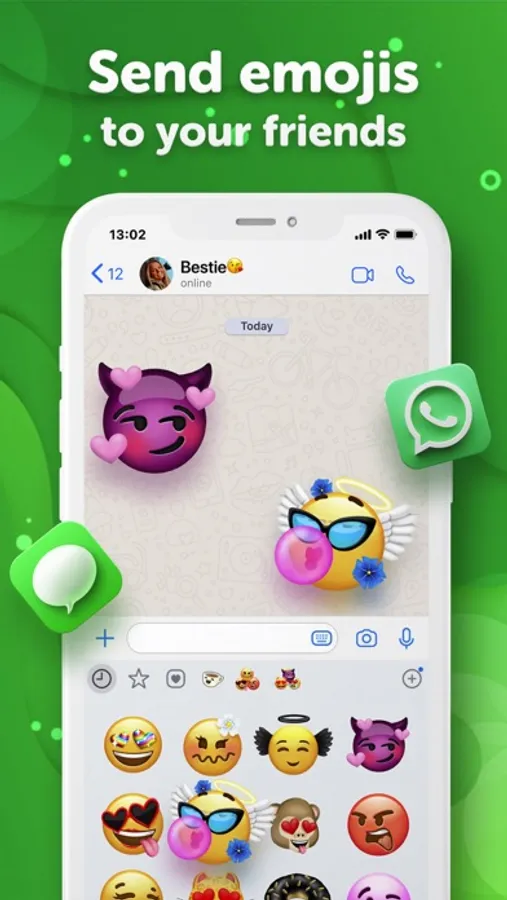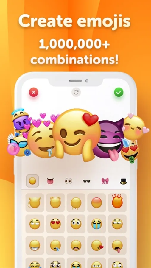 • Create your own emoji and have fun with endless combinations of bases, eyes, mouths, gadgets, hats, crowns, hearts, glasses and hands.