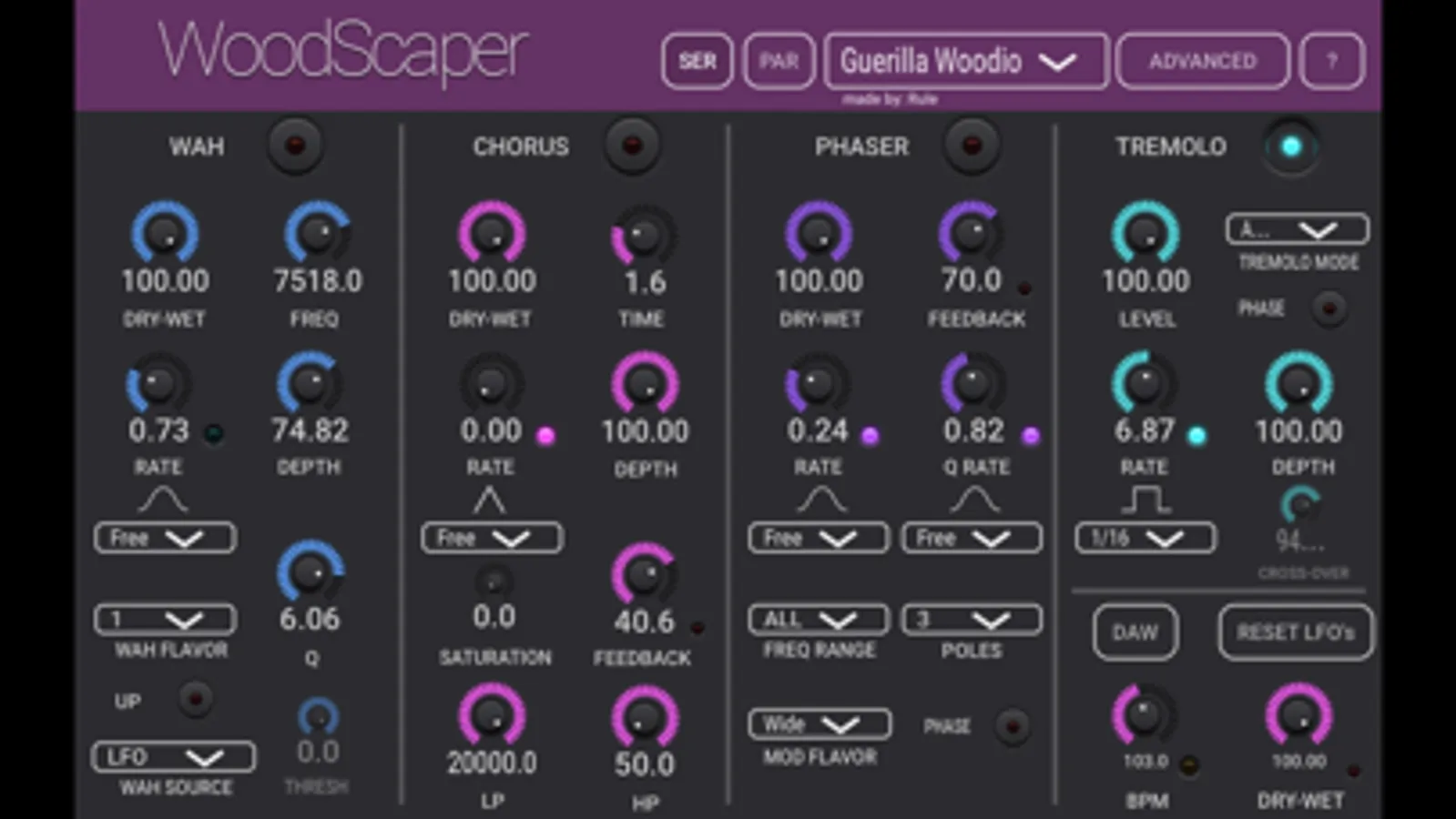 WoodScaper combines into one unit the 4 classic guitar effects : phaser, chorus/flanger, wah-wah and tremelo. Besides the familiar controls each effect has some extra not-so-commonly-found options. The 4 effects can be routed in series (pedalboard mode), parallel (DAW mode) or some combinations of those modes. Panning or the Stereo control can create stereo sounds from a mono input source. WoodScaper is both stand-alone and an AUv3 effect.