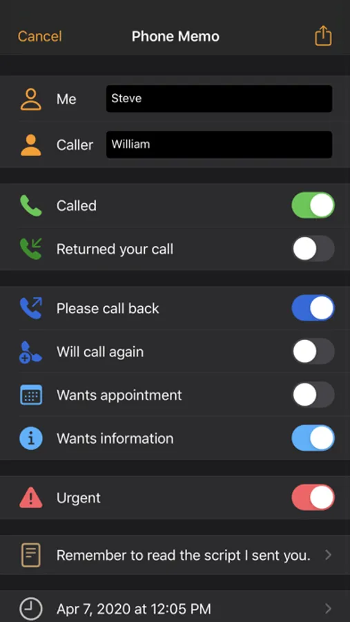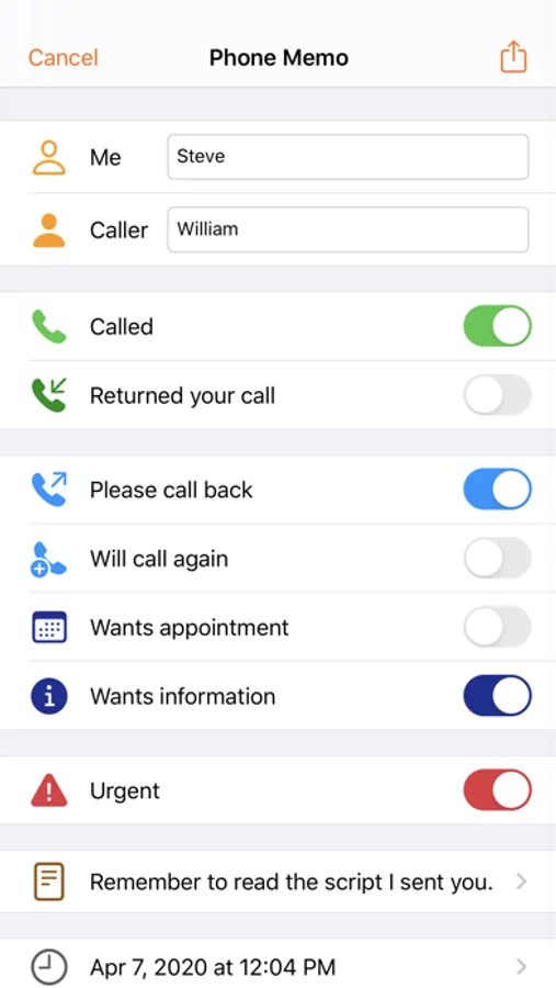 It could hardly be easier: Tap on "New Phone Memo", enter your name and the name of the caller. Use the sliders to design the message. There is also space for additional notes.