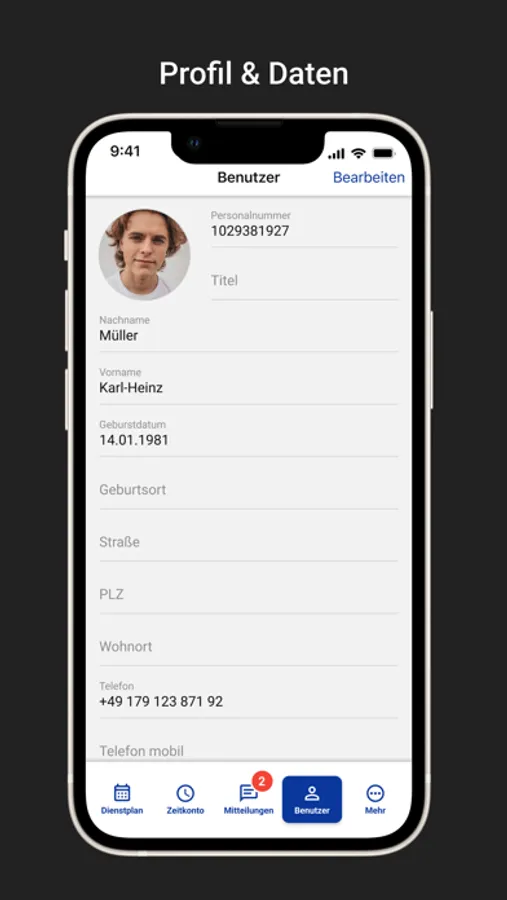 Mit TIMEOFFICE mobile kannst Du Deine persönlichen Daten wie Telefonnummer und E-Mail-Adresse jederzeit aktualisieren. Da die App mit den Stammdaten in TIMEOFFICE verknüpft ist, wird die Anpassung automatisch übernommen.