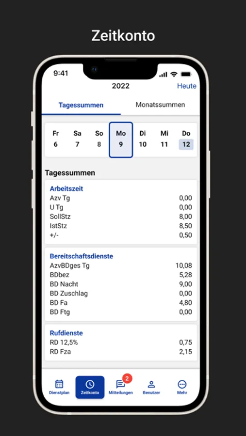 In den Zeitkonten siehst Du etwa, wie viel Resturlaub Du noch hast, wie viel Stunden Mehrarbeit pro Tag aufgelaufen sind und wie viele Bereitschaftsdienste Du geleistet hast.