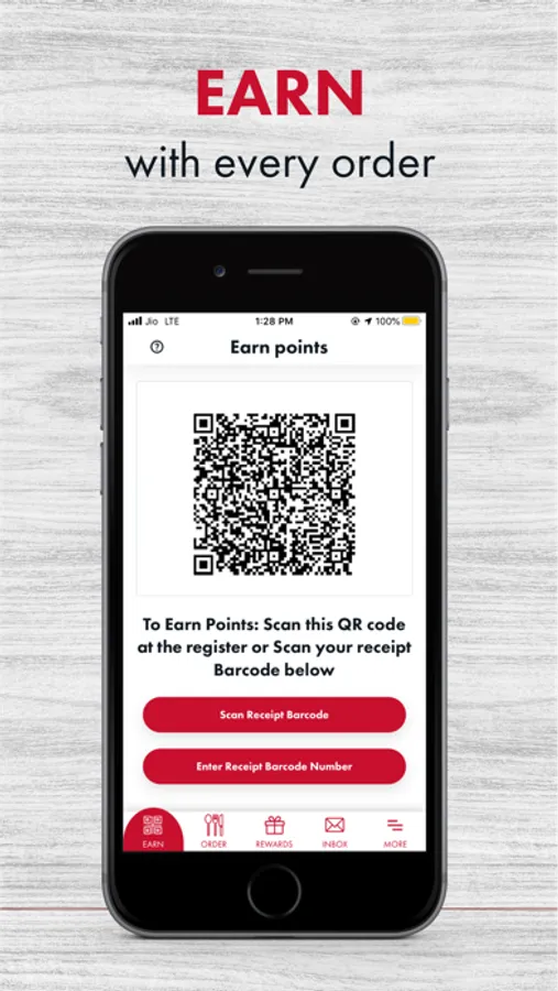 Order in-store: Scan your App QR code at the register each time you order or Scan the barcode at the bottom of your receipt after ordering.