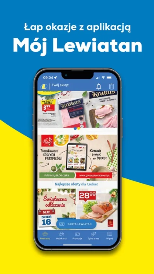 Pobierz i zainstaluj aplikację Mój Lewiatan na swoim telefonie aby sprawdzić promocje w Twoim Sklepie Lewiatan, obejrzeć najlepsze oferty dla Ciebie, wybrać ulubione produkty marki Lewiatan, zbierać punkty w programie Mój Lewiatan oraz znaleźć najbliższy sklep Lewiatan!
