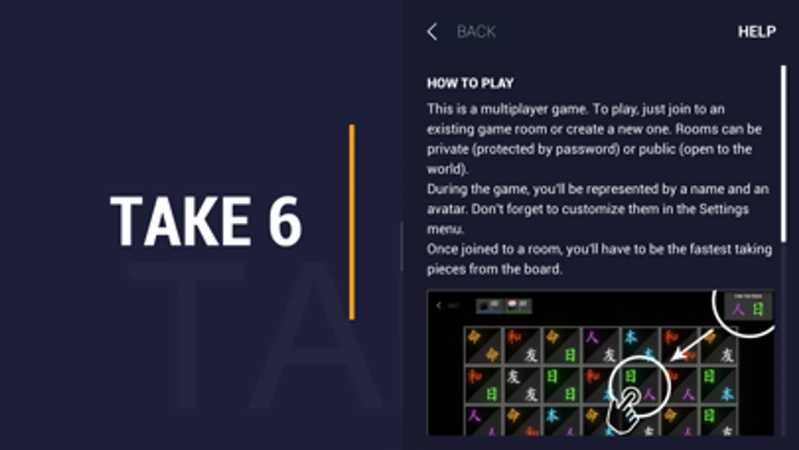 Take6 is a very easy to play game, but a challenge for fast minds, too. You can play against friends, family or unknown people around the world. Two random symbols tell players which piece has to be found in each round. Be the fastest touching it and it will be yours. Get 6 pieces to win.
