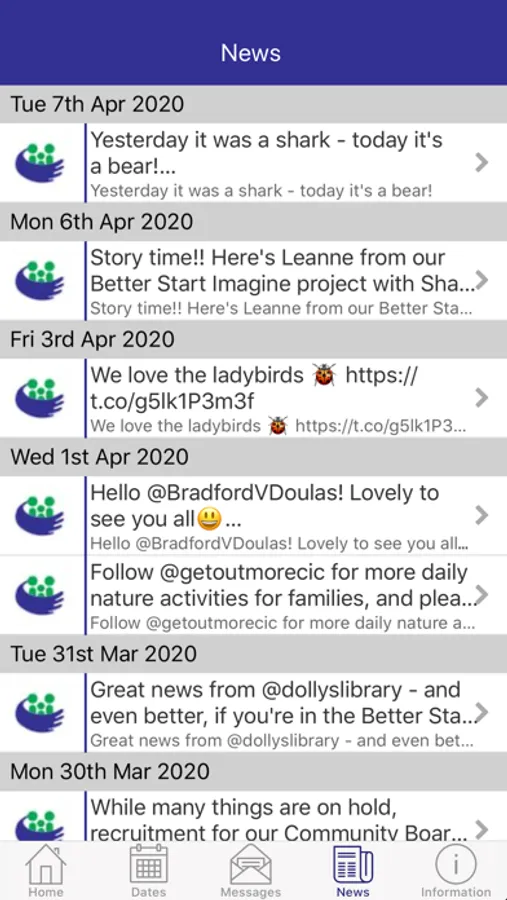 Shows all the latest stories from your school or organisation. If you tap on any news item you will be able to see more detail.