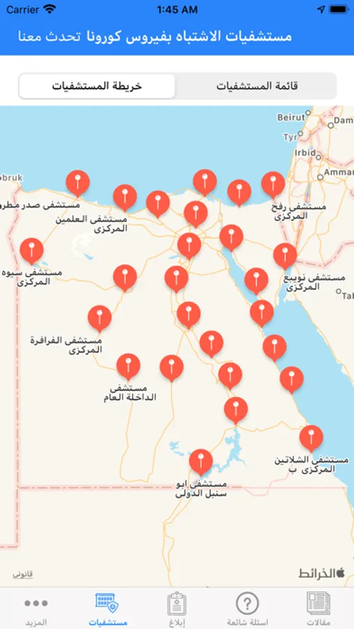 2- الإشعارات: سيصلك رسائل تنبيه إذا ما اقتربت من أحد المواقع التي تحتوي على إصابات حتى تأخذ حذرك وتتجنب الإصابة ويستلزم تفعيل هذه الخاصية السماح للبرنامج بتتبع موقعك وتفعيل هذه الخاصية في تليفونك المحمول.
