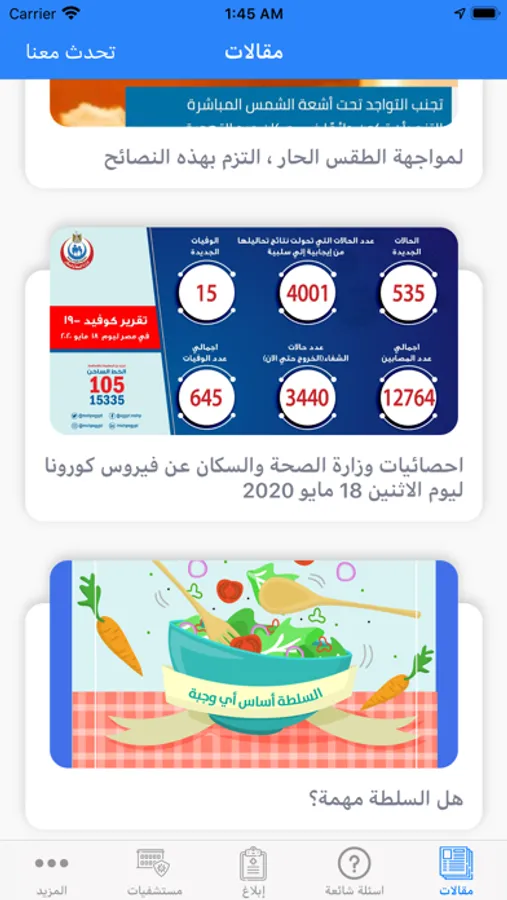 3- مقالات: وتشمل مقالات متنوعة وشاملة عن كل ما يهمك من أساليب الوقاية والعادات أو الأخطاء التي من الممكن أن تتسبب في نقل العدوى ونصائح تقوية المناعة وكيفية التعامل في كافة المواقف اليومية لتجنب العدوى بالإضافة إلى كل ما يستجد من معلومات حول الفيروس وكيفية مواجهته.