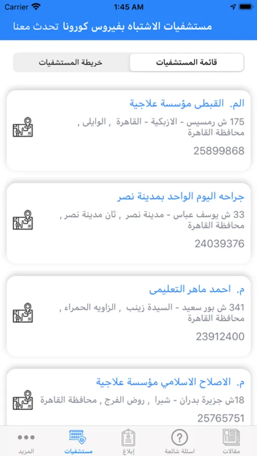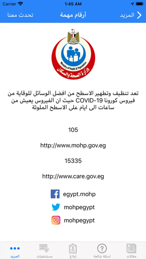 6- أرقام تهمك: يعرض البرنامج لك كافة الأرقام والروابط التي تمكنك من التواصل مع وزارة الصحة بكل وسائل الاتصال والتواصل الاجتماعي المتاحة.