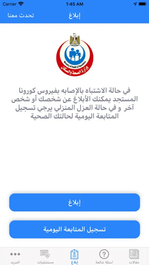 1- الإبلاغ: وفي هذا الجزء يمكنك أن تقوم بالإبلاغ عن حالتك أو عن حالة شخص آخر مع تسجيل بعض المعلومات والأعراض التي يطلبها البرنامج وذلك لتحديد مدى احتمال الإصابة بناء على الإجابات التي سيتم تسجيلها ونتيجة لمدى احتمال الإصابة سيتم توجيهك لكيفية التصرف وما هو الإجراء المناسب لحالتك أو لحالة الشخص المبلغ عنه.