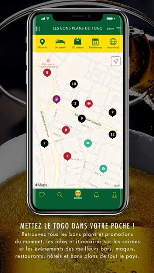 Ainsi le but de cette application est de permettre aux Togolais comme aux touristes de rechercher et de trouver les meilleurs endroits pour leurs sorties sur le Togo : Bonnes adresses, maquis ou bars du moment, événements et soirées branchés …