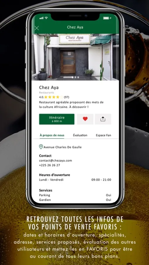 - Consulter la fiche des établissements référencés sur l’Application : nature du lieu consulté, emplacement, événements, promotions, informations pratiques ;