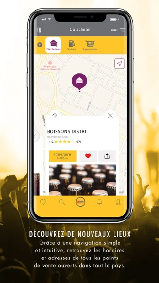 SABC C’est VOUS est une application mobile qui répertorie l’ensemble des cafés, hotels, bars, snacks, restaurants, point de vente des produits SABC, distributeurs pour vous livrer à domicile.