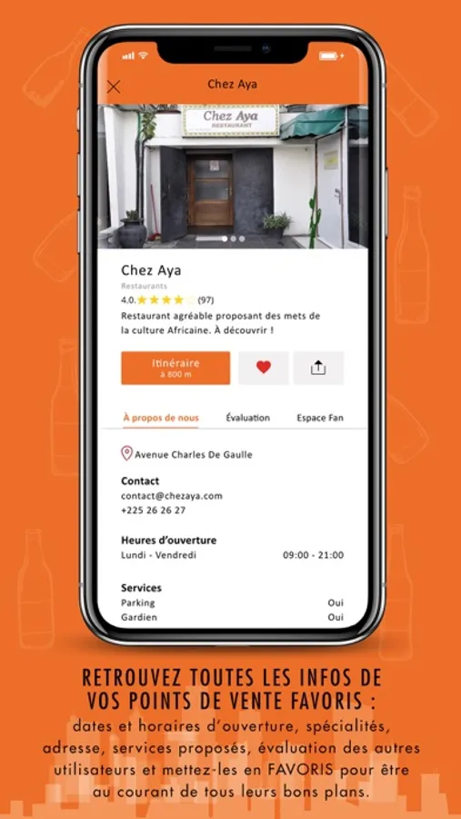 - Consulter la fiche des établissements référencés sur l’Application : nature du lieu consulté, emplacement, événements, promotions, informations pratiques ;